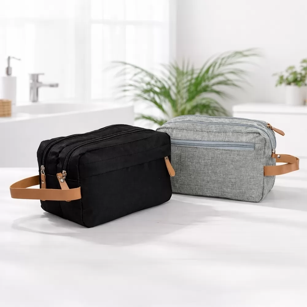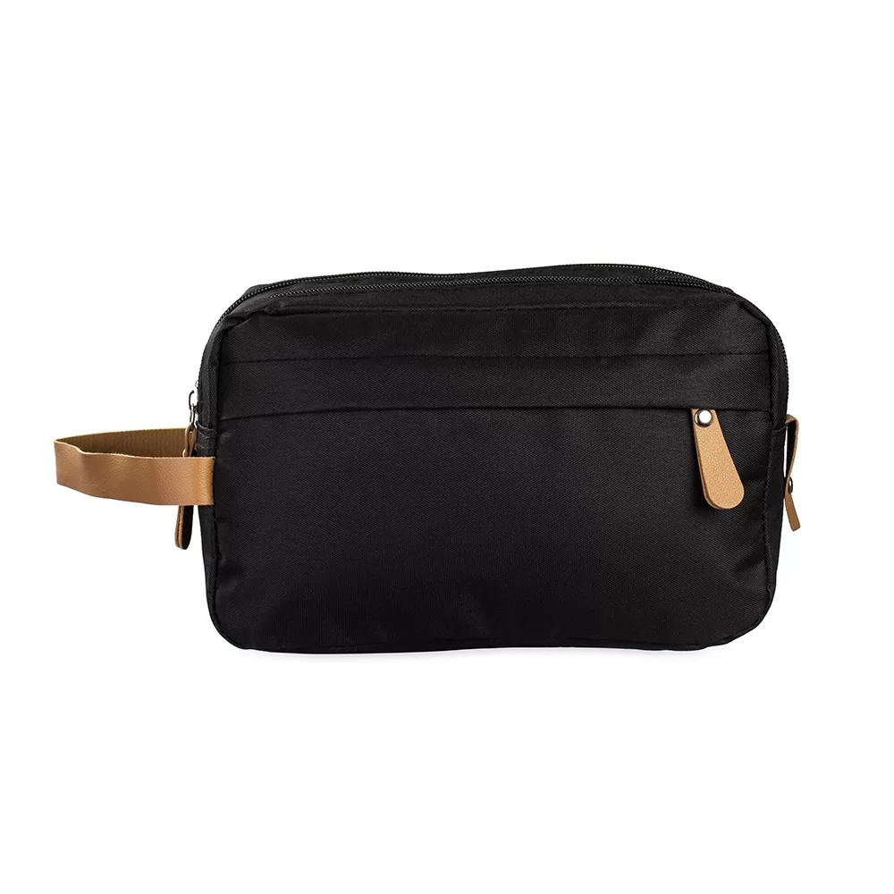 Nécessaire em poliéster 300D catiônico resistente à água com alça de mão lateral e puxadores de zíper em couro sintético. Possui dois compartimentos com revestimento em poliéster 210D, sendo um deles com cinco bolsos de diferentes tamanhos, incluindo dois em tela. Conta também com dois bolsos externos de tamanhos variados e fechamento em zíper.