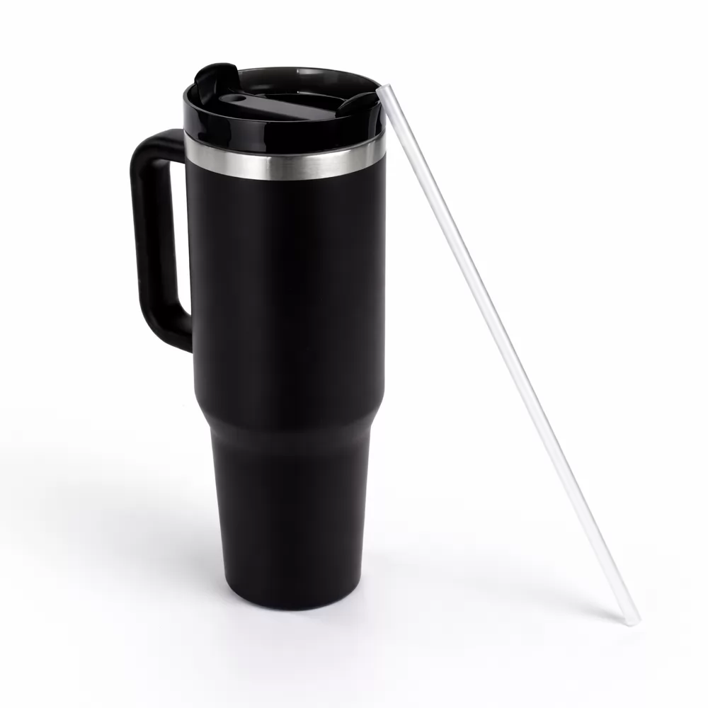 Caneca térmica com capacidade para até 1,2 litro. Conserva a temperatura de líquidos por mais tempo através da sua estrutura de parede dupla composta por camada interna em inox 304 e externa em inox 201 com pintura eletrostática. Conta com tampa rosqueável em plástico polipropileno (PP) com abertura superior giratória e acesso para canudo. Acompanha canudo plástico.